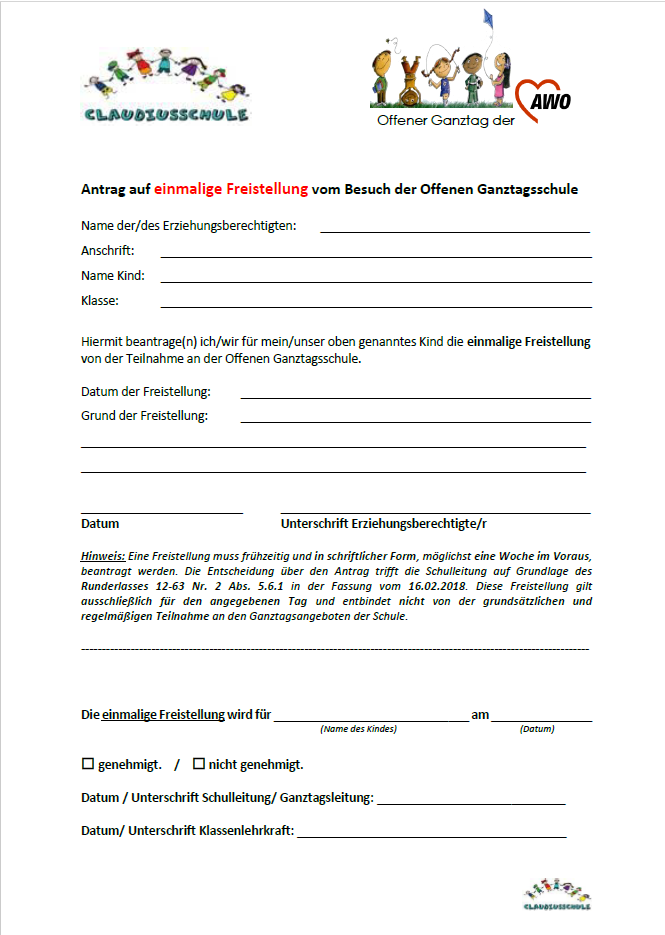 Abholzeiten vor 15.00 Uhr, müssen über einen Freistellungsantrag gestellt werden.